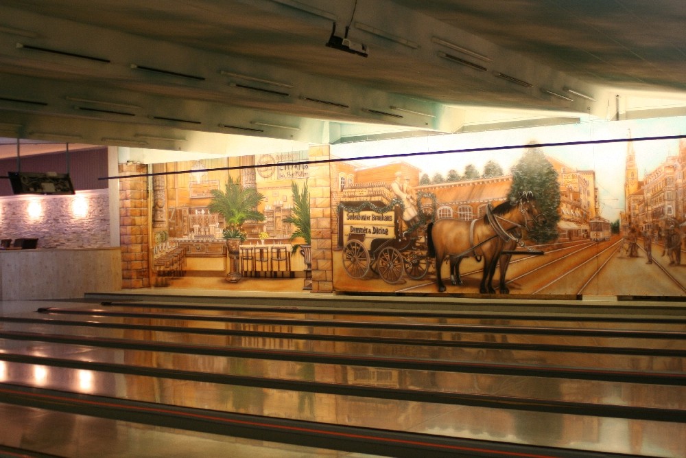 wir freuen uns, Sie in der Bowlingbahn begrüßen zu dürfen. Die Airbrushs an den Wänden erinnern an die alte, und von vielen als